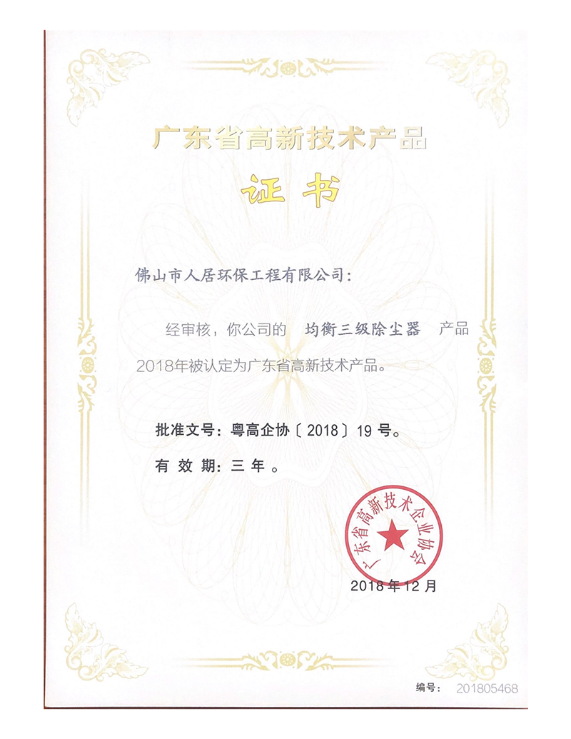 1 、高效除黑油烟尘设备高品证书 2 、介布二元除尘器高品证书